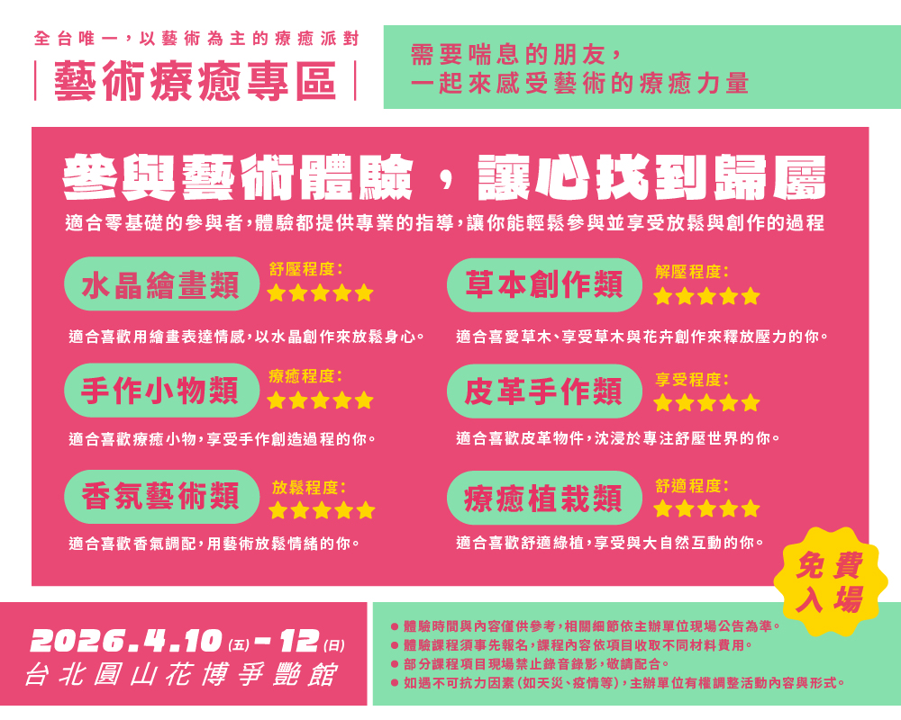 2026年藝術療癒專區-手作系列課程,現正報名中! 點選下方課程圖即可報名!!